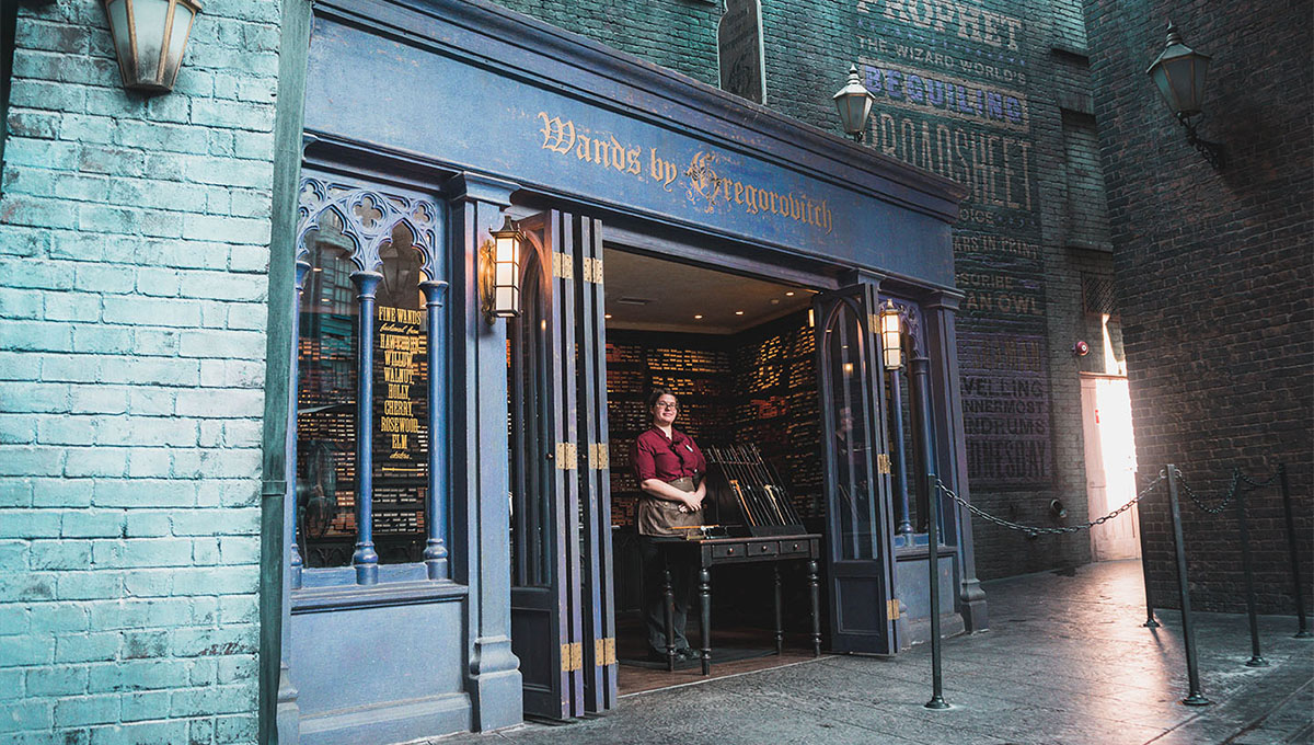 No The Wizarding World of Harry Potter – Diagon Alley, você pode encontrar varinhas interativas no Ollivanders…
