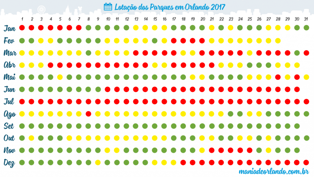 Consulte a tabela abaixo, nela incluímos o indicativo de lotação dos parques e a temperatura aproximada.